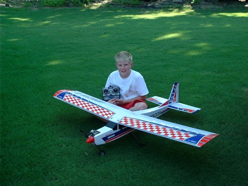 Here is a photo of Matt Wheeler, he is my stepson since June, 2001. Age 9. He is from near Toronto Ontario Canada. I purchased the Apache II in mid June and between The RAMM's field here in Montgomery, and the TRCC in Munford, He solo'ed in September. (He has been rough on the nose gear). I now have to buy a new radio system on another channel so we can fly at the same time. FYI, his trainer uses a Fox 40 Delux and runs great! He can start it himself.