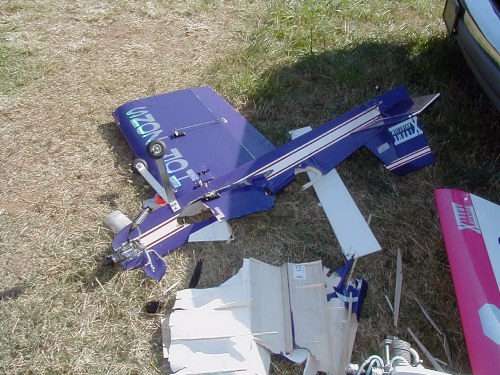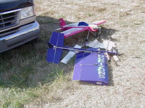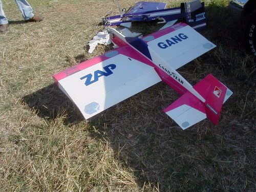 This was the result of a mid-air collision between two identical planes belonging to Pat Thomas and James Goss. Pat's, the purple one, was covered in Monokote. The pink one, belonging to me, was covered in ultracote. The planes were hovering at about 75 feet in the air when they hit. It is amazing that my plane survived with only a crushed leading edge sheeting on the right wing and a cracked fuselage. When they hit, the jolt turned off my receiver. My plane came down in a slow spin and hit on its nose. Before the mid-air my landing gear was bent a little from their normal position. After the mid-air I told Pat he gave my plane a good wheel alignment, they were as straight as they could be.