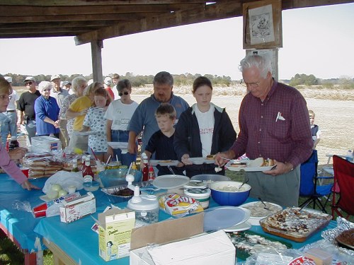 For me the day started about 5:30 am when Mary and I started getting things together. I went by Cecil's house to pick up his grill on my trailer and we arrived at the field around 8:00 am. Cecil and I were the first to arrive and we couldn't believe how pretty the day was starting out. We were expecting rain around dinner so we were content that we had a good-looking morning. We got our shelters set up next to our shed so there would be plenty of shade throughout the day. Loren was the next to arrive and around 9:00am the cars started to come in pretty regular. Soon Pat arrived with his grill and set it up along side Cecil's grill in the rear of the shed. It wasn't long before planes were in the air. By 11:00 am most everyone was there so Cecil and Pat fired up the grills. Mary set the tables up and did a really fine job keeping everything moving. George said grace and the crowd started eating around 11:30. Most everyone brought a side dish and we had some really good food on the table.