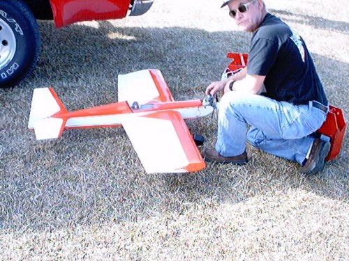 Here is Loren with his new Sig Something Extra. He is powering it with a Saito .52 four stroke engine and this little engine is full of horse power. This engine really sounds good in the air and it will take this 5 lb 3 oz plane vertical with no problem. Loren also found this plane to be a great glider. The other day at the Munford field Loren took the extra about 10 miles high and cut the engine. He flew for the rest of the day, or at least it seemed like he did before it came back to earth.
