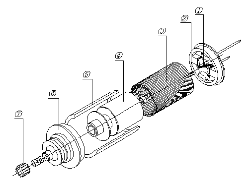 The coreless motor is completely different from the conventional servomotor as shown in the below sketch. The components are as follows: 1 is the brushes, 2 is the commutator, 3 is the rotating coil, 4 is the magnet, 5 is the housing, 6 is the flange or end bell, 7 is the pinion gear.