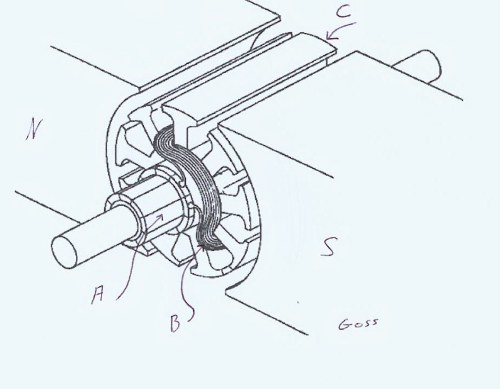 This is the standard servomotor that we have been using for years and it is still the most widely used servomotor around. It is the rotating armature type with stationary field magnets. A is the commutator, B is the armature coils, C is the steel core, and the N and S are the permanent magnets that take the place of field windings. Remember that it takes two magnetic fields to create torque, or twisting action that the shaft offers to the load being turned. The brushes connects dc power to the armature coils by making contact to the commutator. The commutator has contact to the armature windings and when the brushes are connecting any two commutator segments, current flows through the armature windings and generates one of the two magnetic fields needed. This field reacts with the magnetic field from the magnets and rotating torque is developed. The commutator assures that the coils are in the right place at the right time to generate maximum torque.