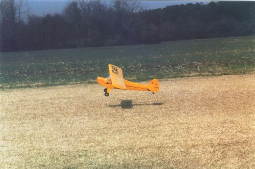 They say a picture is worth a thousand words and I think the above picture proves that to be true. It has always been amazing to me how RC modelers will help other club members when they need it. I remember when I first started in the hobby and all the guys that pitched in and helped me get in the air. No beginner comes into the hobby knowing exactly what to do and how to do it. They learn by reading hobby material, but mostly by watching and talking with other modelers. Our club can only exist if we pass on our experience to newcomers. In the above photo a group of members are seen helping Dan Freeman, on the left, to get his J-3 Cub in the air. To the right of Dan are Jack, Buddy, Gene and Loren. The group got all the details worked out and Dan was in the air. The photo below shows the Cub making a beautiful approach.